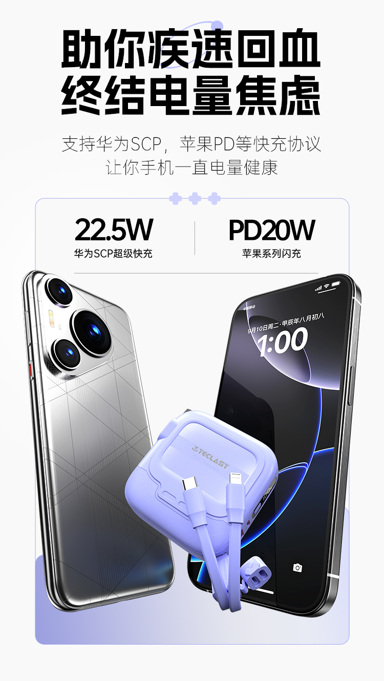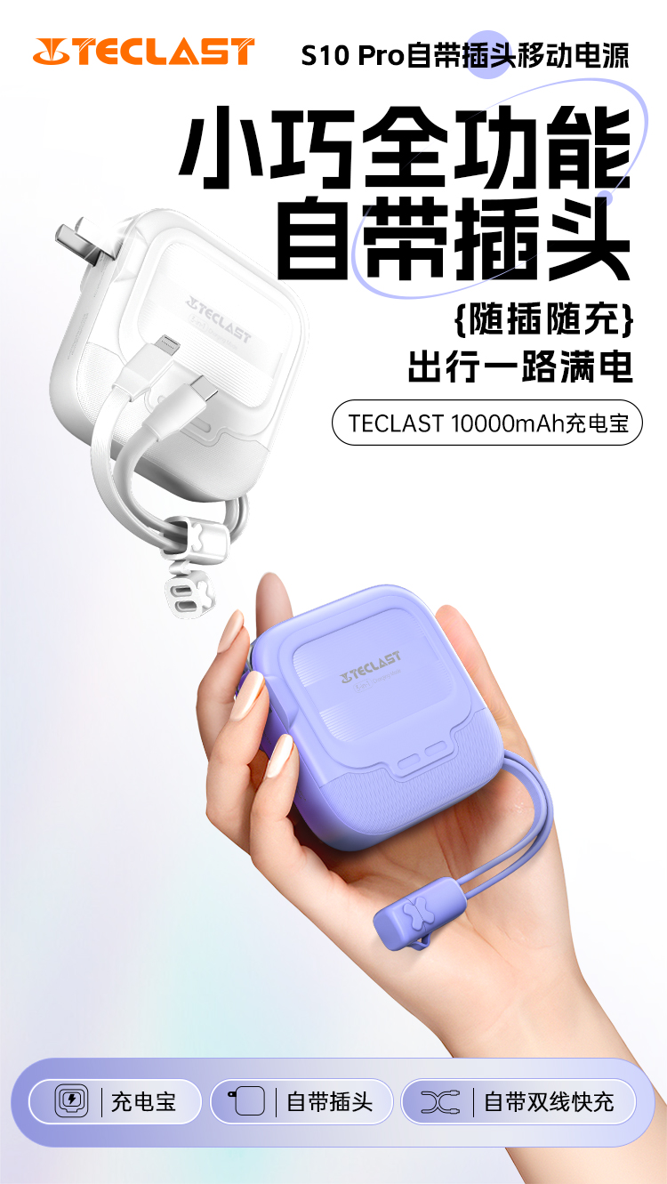 臺電S10 Pro在設計上可謂簡約而不失時尚感,提供紫色和白色兩種配色,滿足了不同消費者的審美需求。其相對輕便的重量僅為240克,意味著即使長時間攜帶也不會造成負擔,這對于經常出行的用戶尤其重要。更加貼心的是,S10 Pro內置了USB-C和Lightning線,用戶無需額外攜帶充電線,提升了使用的便利性。