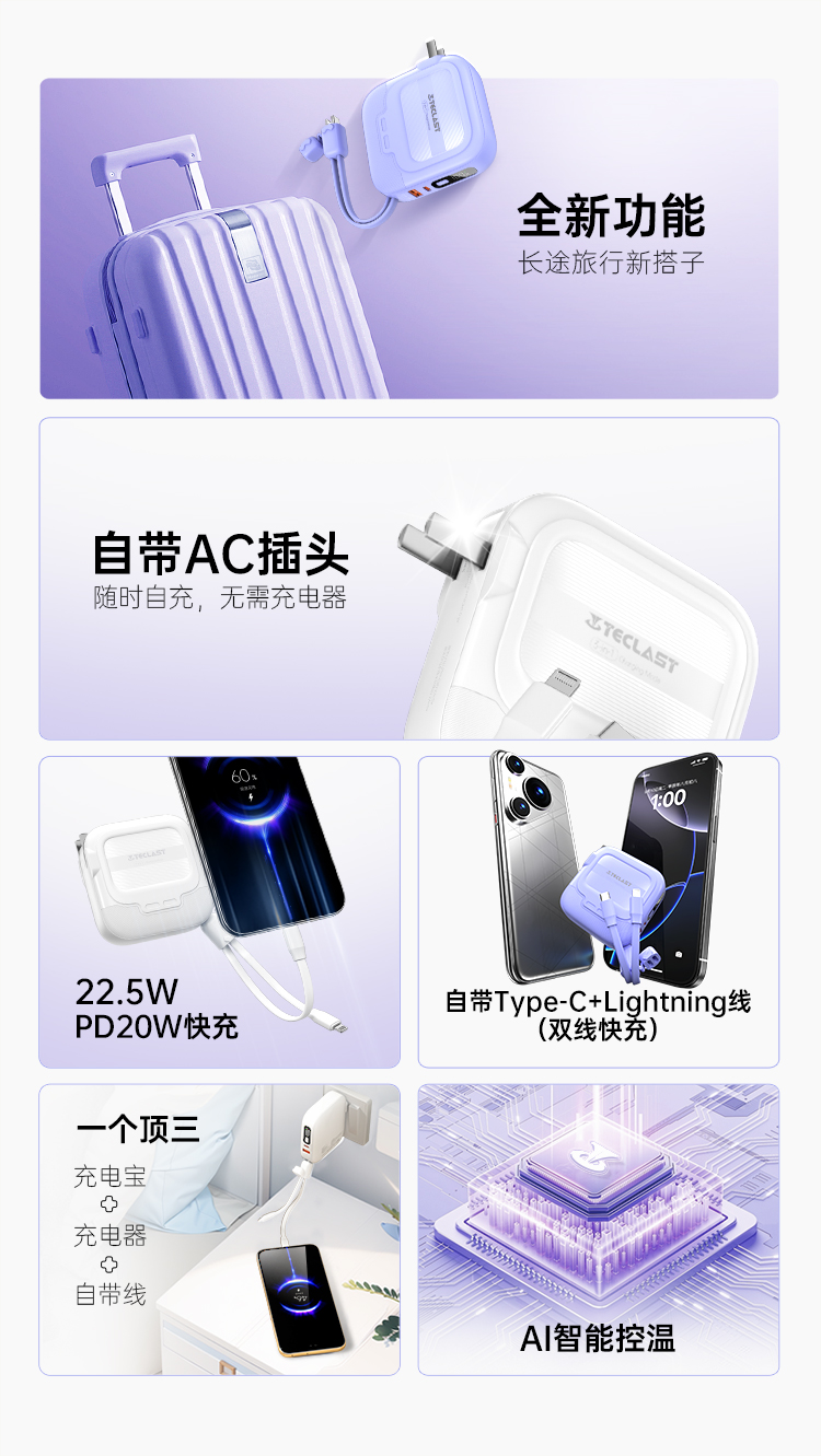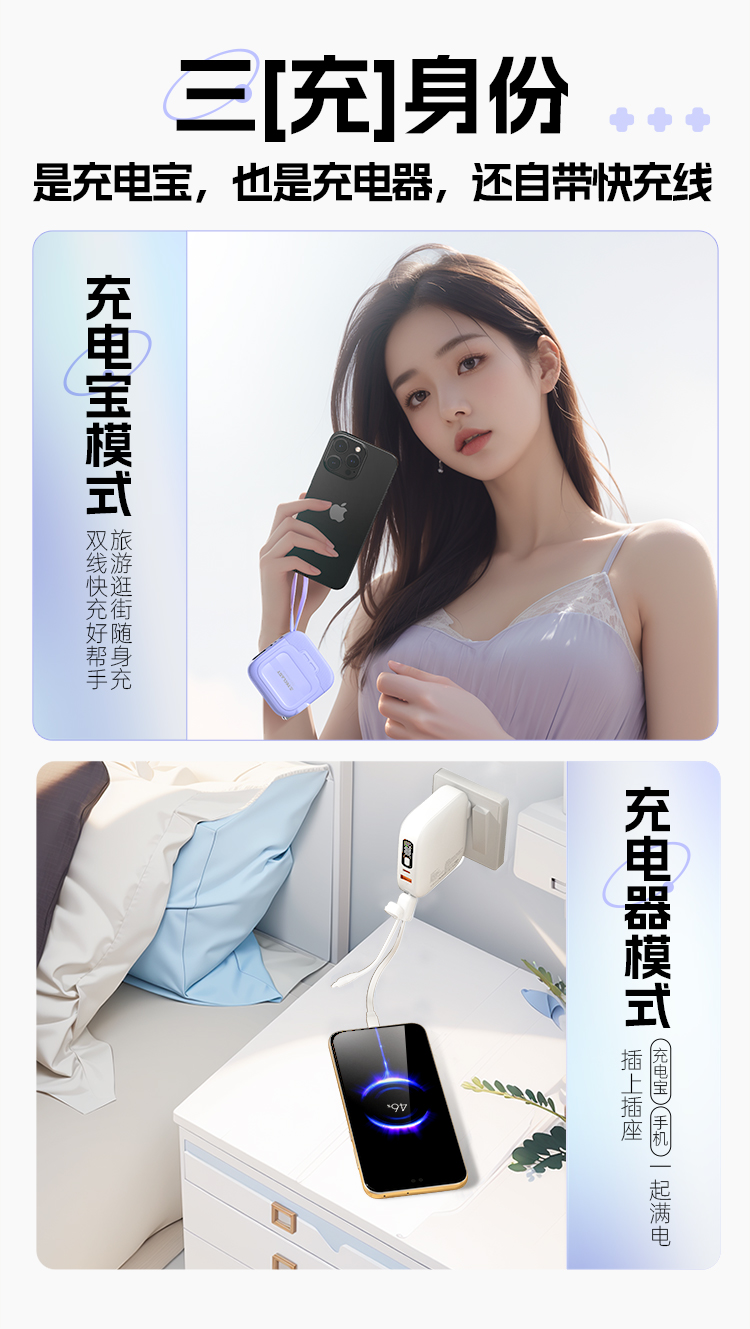 這款充電寶最大的亮點在于其自帶插頭和雙線的設計。無需攜帶額外的充電線和插頭,直接插入插座即可為充電寶本身充電,同時也能為其他設備充電。這樣的設計極大地簡化了充電過程,讓您的和背包行李箱不再被各種充電線纏繞,真正實現了“一寶在手,充電無憂”。