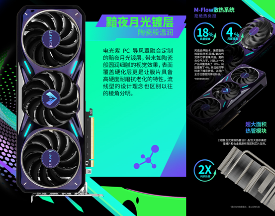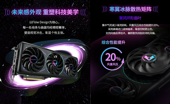外觀上,它采用新一代Flow Design設(shè)計語言,側(cè)邊星河流光燈條搭配ARGB燈光同步功能,璦珈RGB合金背板創(chuàng)新加入夢幻撞色燈效,層疊幻彩光影為玩家延展出更沉浸的空間氛圍。為應(yīng)對高性能帶來的熱量,顯卡在散熱效能上進行全面升級,3*10CM聚風(fēng)環(huán)形扇葉可集中氣流、減少湍流損耗,進口高端滾珠軸承讓噪音控制更出色,再加上風(fēng)扇啟停技術(shù),完美兼顧散熱效能和待機風(fēng)噪。高效散熱模組能快速傳導(dǎo)熱量,進一步優(yōu)化散熱效果,讓 4K 高畫質(zhì)運行《二重螺旋》時穩(wěn)定在線。