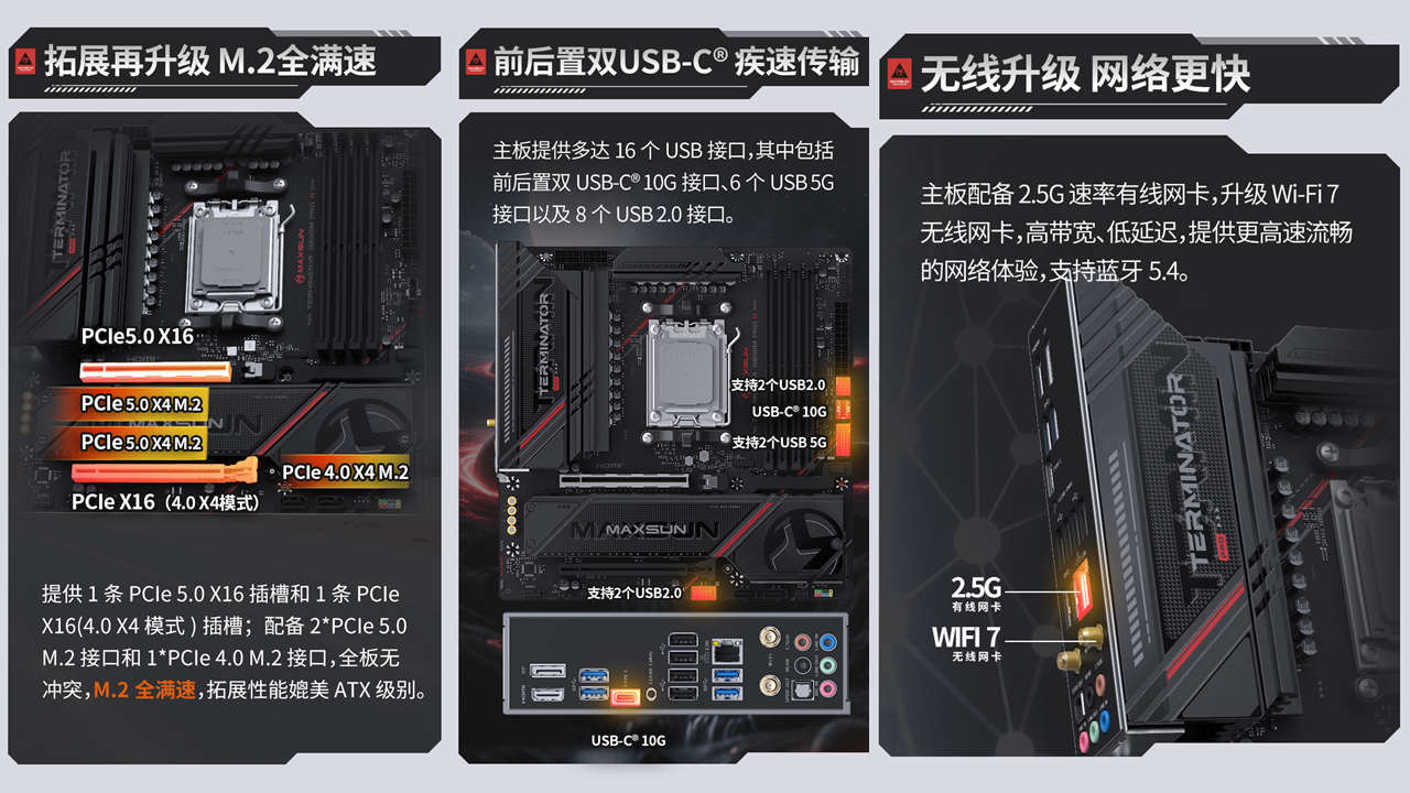 該主板在拓展和網(wǎng)絡(luò)方面還進(jìn)行了升級(jí),主板提供2 個(gè) PCIe 5.0 X4 M.2 接口與 1 個(gè) PCIe 4.0 X4 M.2 接口,全部支持 NVMe 協(xié)議,實(shí)現(xiàn)M.2全滿速傳輸。同時(shí)配備1 條 PCIe 5.0 X16 插槽與 1 條 PCIe X16(4.0 X4 模式)插槽的配置,全板無沖突,拓展性能媲美 ATX 級(jí)別,能輕松滿足多設(shè)備連接、多場(chǎng)景使用的需求。網(wǎng)絡(luò)體驗(yàn)迎來跨越式升級(jí),原生搭載的 Wi-Fi 7 無線網(wǎng)卡配合 Realtek RTL8125D 2.5G 高速有線網(wǎng)卡,支持藍(lán)牙 5.4,高帶寬、低延遲的網(wǎng)絡(luò)傳輸,讓AMD銳龍 7 9850X3D 處理器在在線游戲、高清直播、高速下載等場(chǎng)景中都能流暢無憂,盡情發(fā)揮性能。