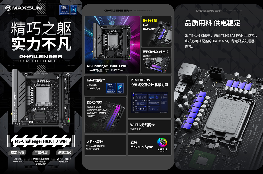 想要發(fā)揮處理器性能、連接各類硬件,一款適配性強、功能全面的主板至關(guān)重要。銘瑄Challenger H810ITX WIFI主板專為緊湊型主機設(shè)計,17cm×17cm的標準ITX 版型,能輕松裝入市面上絕大多數(shù)迷你機箱,同時在供電、拓展、穩(wěn)定性上毫不妥協(xié),堪稱“小而全”的典范。這款主板采用8+1+1相供電設(shè)計,搭配RT3638AE PWM主控芯片與每相 50A Dr.Mos ,供電電流穩(wěn)定且供電能力充足。即便處理器處于高負載運行狀態(tài),也能持續(xù)提供穩(wěn)定電力,避免因供電不足導(dǎo)致的性能波動,能充分釋放英特爾酷睿Ultra 5 230F處理器的性能。