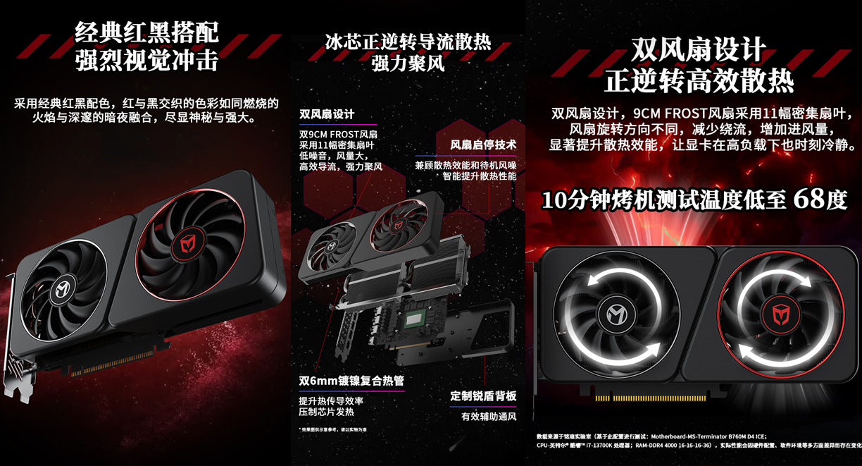這款顯卡外觀設(shè)計上經(jīng)典紅黑配色很具視覺沖擊力,紅與黑交織如同火焰撞入暗夜,神秘又霸氣,放在桌面就是顏值擔當。核心性能更是硬核,20 個 Xe 內(nèi)核搭配 2850MHz 超高加速頻率,無論是 3A 游戲的高負載場景,還是專業(yè)創(chuàng)作的算力需求,都能流暢響應(yīng);12GB GDDR6 大顯存 + 456GB/S 高速帶寬,數(shù)據(jù)傳輸無瓶頸,復(fù)雜多任務(wù)處理也游刃有余。散熱與實用功能雙在線:雙 9CM FROST 正逆轉(zhuǎn)風(fēng)扇搭配 11 幅密集扇葉,減少繞流、提升進風(fēng)量,配合雙 6mm 鍍鎳復(fù)合熱管與定制銳盾背板,10 分鐘烤機溫度低至 68℃,高負載下也能冷靜運行;支持風(fēng)扇啟停技術(shù),兼顧散熱效能與待機靜音。接口配置豐富實用,3 個 DP2.1+1 個 HDMI2.1a 接口,多屏顯示、超高清影音、高分辨率游戲需求全覆蓋,還搭載雙硬件編解碼器,支持 AV1 格式與 Intel Deep Link 超級編碼,讓直播推流更順暢,視頻剪輯導(dǎo)出速度大幅提升,創(chuàng)作效率直接翻倍。